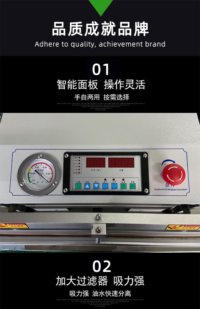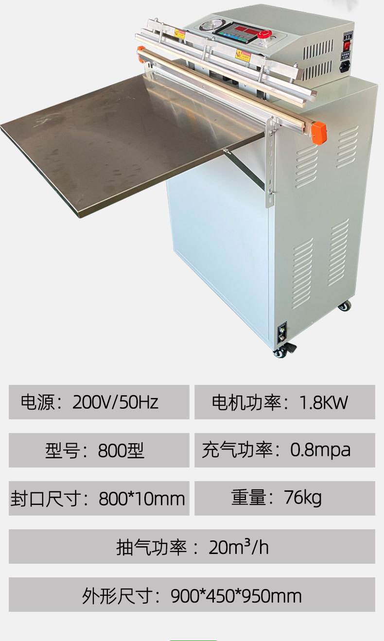 - 內(nèi)抽式真空包裝機(jī):有一個(gè)密封的真空室,通常由不銹鋼制成,配備真空泵、真空表、熱封裝置等。真空室體積較大,以便容納不同尺寸的產(chǎn)品和包裝材料。