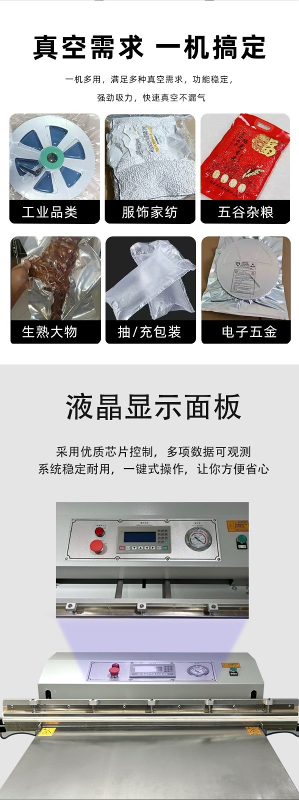 - 外抽式:無需頻繁開關真空室門,包裝袋放置和取出方便,包裝速度快,每分鐘可完成 3 - 5 次包裝循環。