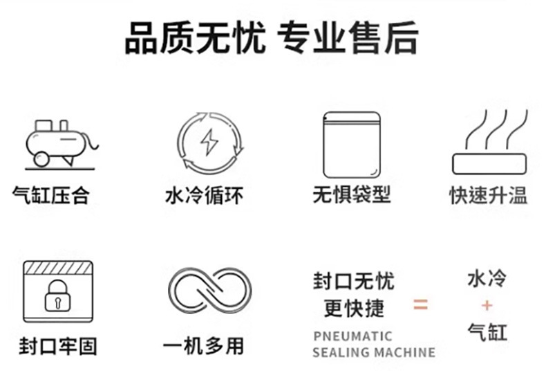 • 風(fēng)冷封口機(jī)是利用風(fēng)扇產(chǎn)生的氣流來冷卻封口處,冷卻速度相對(duì)較慢。水冷封口機(jī)的冷卻效率更高,能更迅速地帶走封口熱量。比如在連續(xù)高速封口的情況下,水冷封口機(jī)能夠更快地使封口處溫度降低,滿足高效生產(chǎn)的需求。
