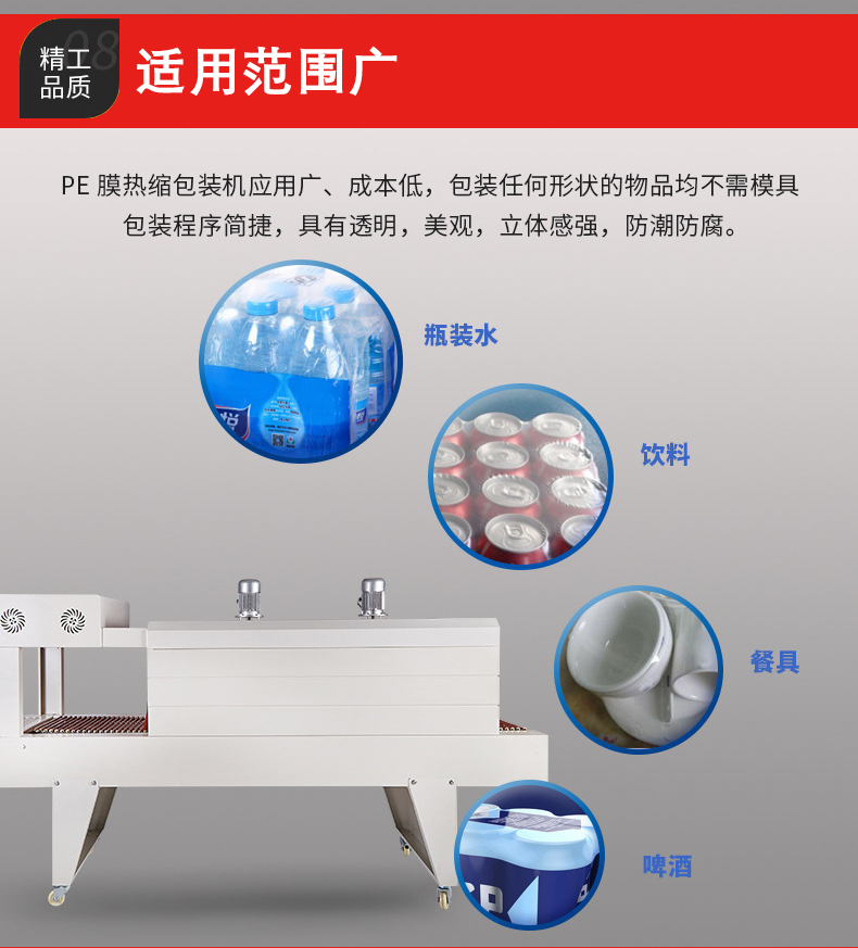 適用范圍廣:可以用于包裝各種形狀和尺寸的產(chǎn)品,無(wú)論是規(guī)則的圓柱體、長(zhǎng)方體,還是不規(guī)則的產(chǎn)品,只要選擇合適的 PE 薄膜,都可以用這種機(jī)器進(jìn)行包裝。而且它可以與其他包裝設(shè)備和生產(chǎn)線集成,實(shí)現(xiàn)自動(dòng)化包裝,提高生產(chǎn)效率。