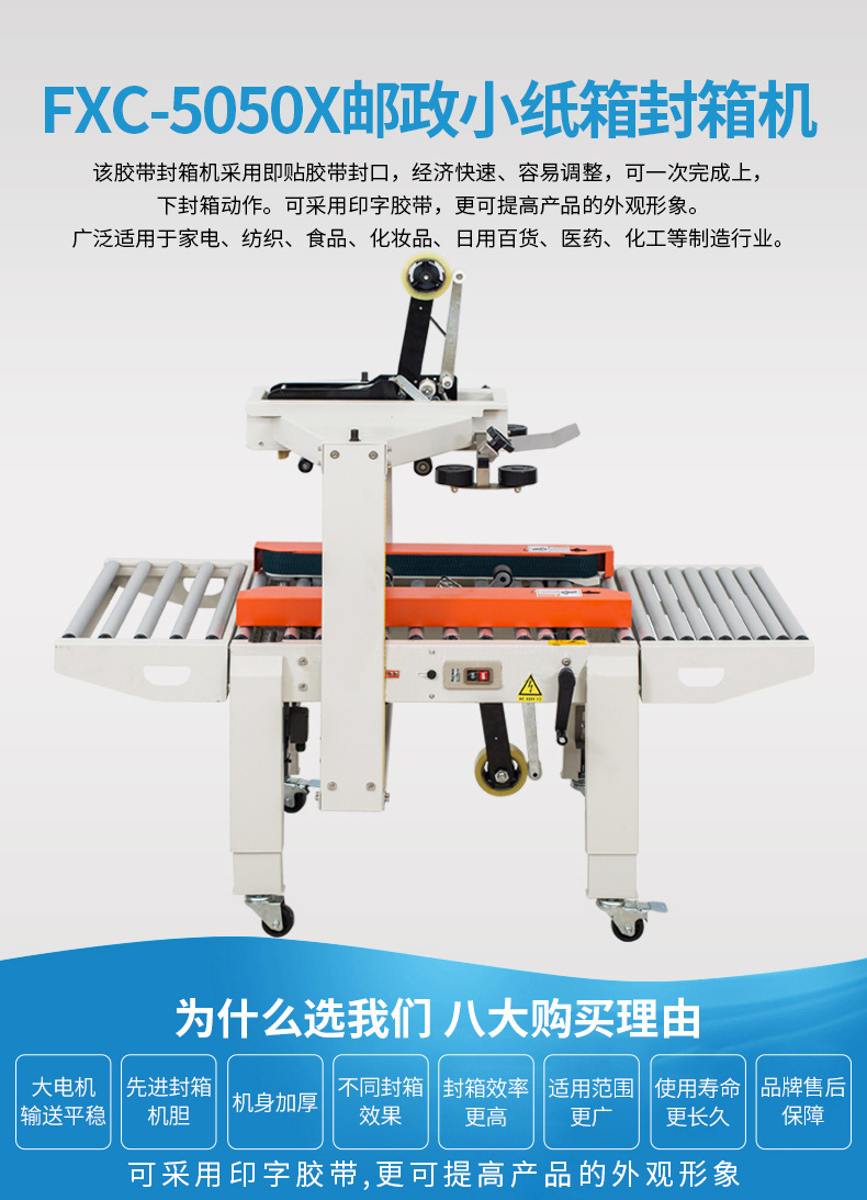 封箱機主要適用于紙箱的封箱包裝,既可單機作業,也可與流水線配套使用,它可單箱作業,也可與紙箱成型開箱機、裝箱機、貼標機、捆包機、棧板堆疊機、輸送機等設備配套成包裝流水線使用,為包裝流水線作業必須的設備