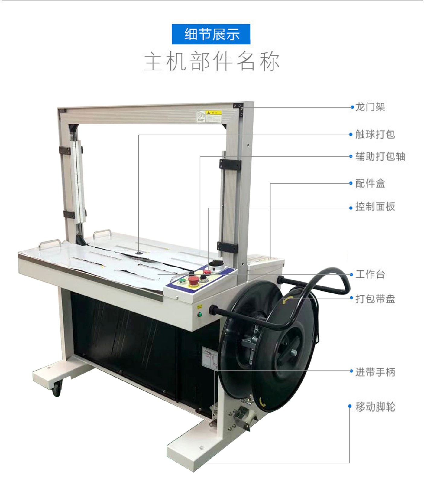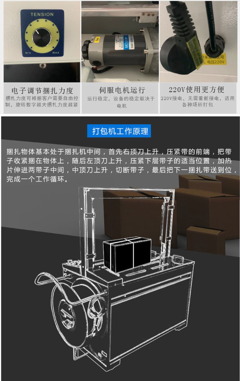 打包機又稱捆包機、打帶機或捆扎機,是使用捆扎帶捆扎產品或包裝件,然后收緊并將兩端通過發熱燙頭熱融粘接方式結合。打包機的功能是加固包裝物品的,使物品在搬運過程中、貯存中不因捆扎不牢而散落,同時還應捆扎整齊美觀。
