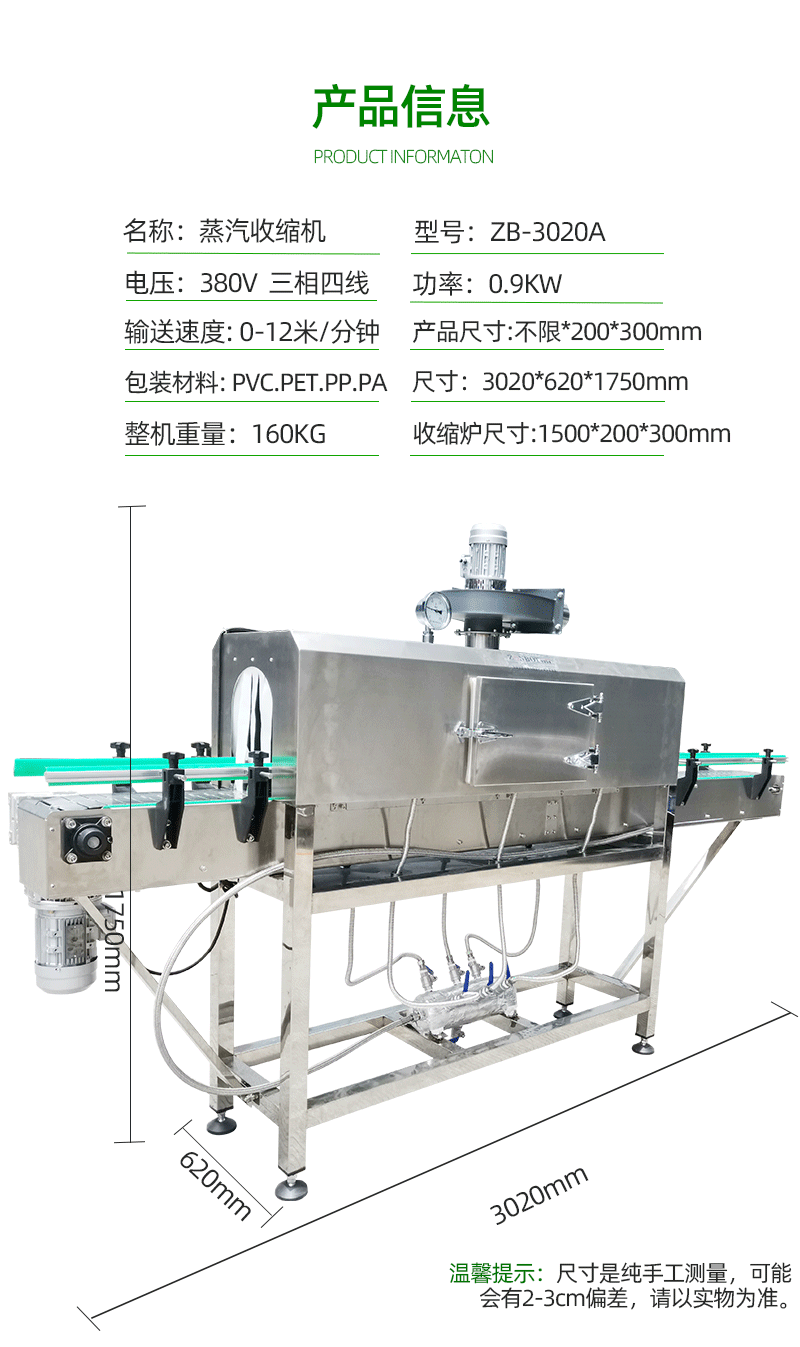 蒸汽收縮機是一種設計精巧、外型美觀的設備,具有不占空間、移動和安裝迅速快捷的特點,以及超大范圍的調節能力,使其能夠適用于各種輸送帶和滑道。這種機器通過吸收國外先進技術并結合國內現狀,能夠自動收集、整理、堆放各種包裝材料,克服了國內同類機器容易震動的堆疊不穩定、易卡、不適應重量輕、體積小的小盒產品的缺點,拓寬了機器在包裝領域的適應性和能力。